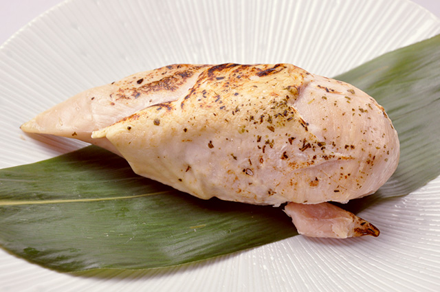 ありたどりのムネ肉を蒸して、塩、胡椒、ハーブをまぶして炙ったハーブ焼きチキンです。無添加で安心安全です。解凍するだけで食べられます。